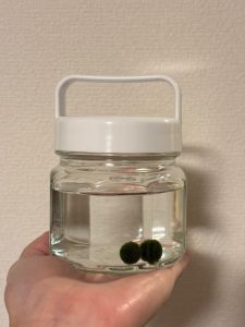 帰宅後、さっそくマリモに名前をつけて愛でていました。