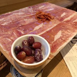 これはディプントに来たら絶対に外せない看板メニューです!本当に「てんこ盛り」という表現がぴったりなボリュームで提供されます。塩気と旨みが凝縮された生ハムとサラミは、赤ワインとの相性が抜群。さらに、このてんこ盛りには冷凍ブドウが付属しています。この冷凍ブドウを生ハムで巻いて食べると、ブドウのシャリシャリ感と爽やかな甘さが、生ハムの塩気をまろやかにして、まさに絶品! ぜひ試してほしい食べ方です。