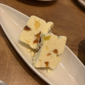 食後のデザートとして、またはワインのお供にもなるユニークな一品が、このフルーツラムバターです。ラム酒が優しく香る濃厚なバターに、ドライフルーツがたっぷり練り込まれています。